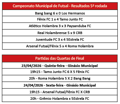 O Campeonato Municipal de Futsal de Holambra entra em sua fase eliminatória a partir desta semana, com a disputa das quartas de final marcada para quinta-feira, dia 23, e sexta-feira, dia 24 de abril, no Ginásio Municipal.